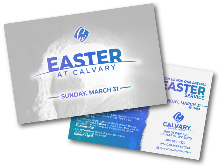 This Easter invitation card welcomes the community to celebrate the resurrection of Jesus Christ at our home church, Calvary Baptist Church. Featuring imagery of the empty tomb and a clean, modern design, it highlights the hope and victory of Easter while providing clear service details and church information. Alongside the invitation, key Scripture verses share the message of salvation and the life-changing hope found in Christ. This design works well keeping the consistent image and design style as the invitation tract above.