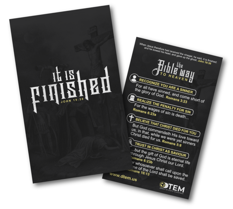 This gospel tract centers on the powerful words spoken by Christ at the cross: “It is finished.” (John 19:30). Set against a dramatic depiction of the crucifixion, the design highlights the completed work of redemption accomplished through Jesus’ sacrifice. With bold typography and a solemn visual tone, the tract immediately draws attention to the heart of the gospel—Christ paid the full price for sin so that salvation might be freely offered to all who believe.