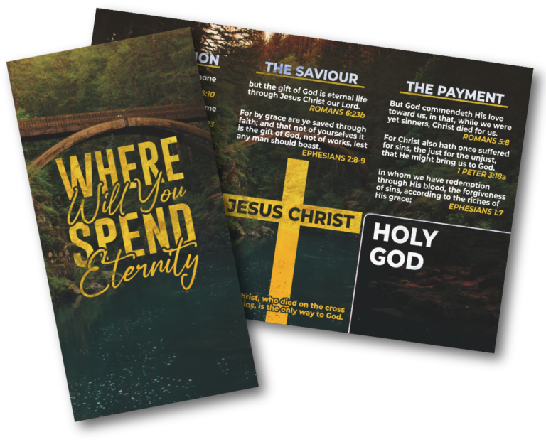 This tri-fold gospel tract asks one of life’s most important questions: Where will you spend eternity? Using the imagery of a bridge crossing a great divide, it illustrates how sin separates humanity from a holy God and how Jesus Christ provides the only way across. Through clear Scripture passages and a simple step-by-step explanation of the gospel, the tract points readers to the hope of forgiveness and eternal life found through faith in Jesus Christ.