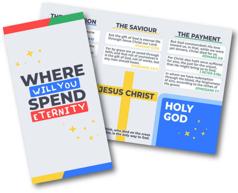 This child-friendly gospel tract presents the message of salvation in a clear and simple design for younger readers. Using bright colors, easy-to-read text, and a clean layout, it asks an important question: Where will you spend eternity? Through key Bible verses and a simple explanation of the gospel, the tract points children to the hope of forgiveness and eternal life through Jesus Christ.