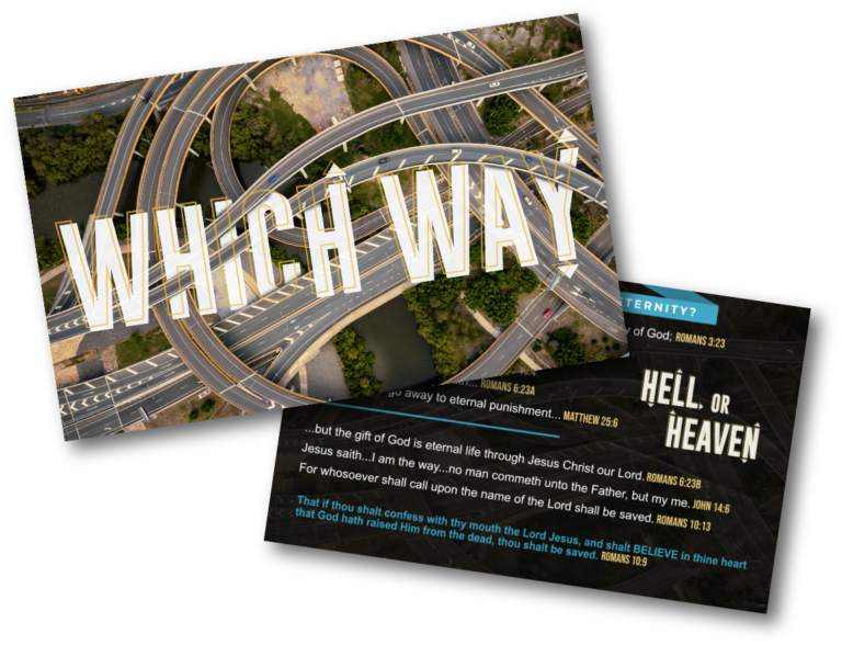 Life is full of choices, and every path leads somewhere. This tract uses the powerful image of intersecting highways to illustrate the many directions people can take in life while asking the important question: Which way are you going? Where will you spend Eternity? Through the truth of Scripture, it points readers to the one path that leads to forgiveness, hope, and eternal life through Jesus Christ.